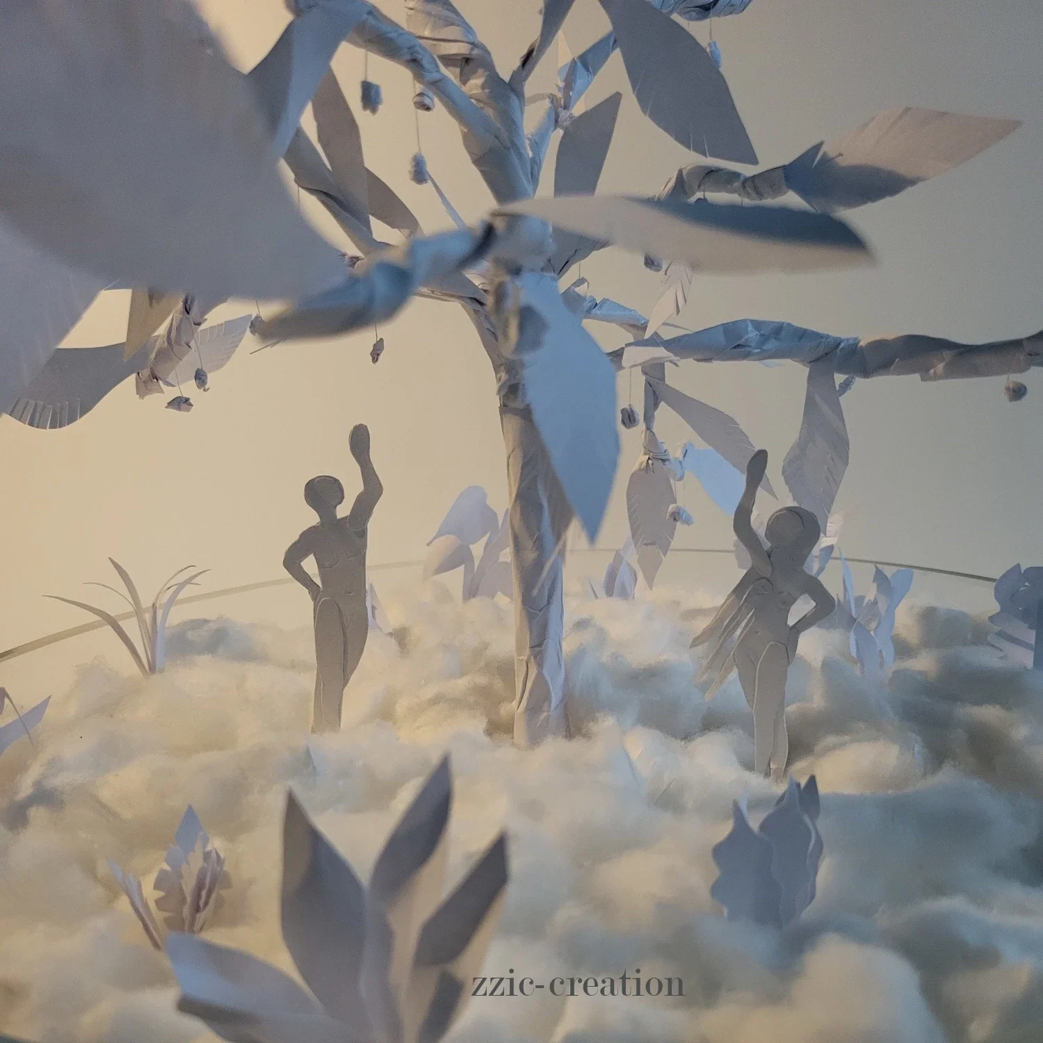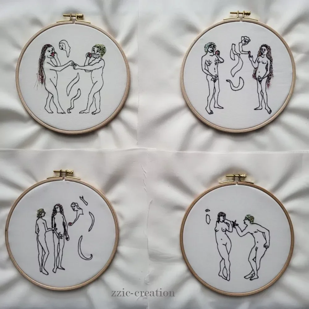 La représentation de ce geste a évolué dans le temps. Le recueil de certaines représentations montre Adam et Eve s’offrant ou mangeant tour à tour ce fruit défendu sans oublier le serpent. Le serpent cachant le diable qui est au centre de cette tentation. En croquant sont des pièces brodées qui reprennent des détails d’œuvres historiques : la Bible française abrégée du XIIIe siècle, Adam et Eve et le fruit défendu de Willem Vrelant de 1460, un détail du Paradis et l’enfer de Jheronimus Bosch 1510, Adam et Eve au Paradis de Jan von Scorel en 1540. Cette série pourrait se poursuivre encore. Les pièces de sculptures en papier blanc, 2 minutes avant et Promenade, ainsi que la toile L’arbre se situent 2 minutes avant ce point de bascule.