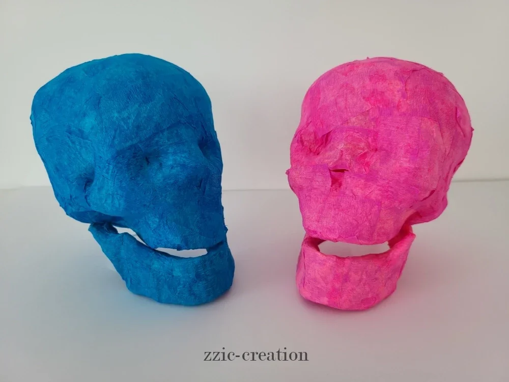 Crânes en papier crépon bleu et rose, 17 x 18 cm
